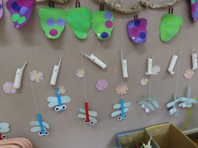 夏の終わりに、園庭の池でヤゴを見つけました!しおからとんぼや、いととんぼなども園庭でよく見かけます。「あ、とんぼだ!」「見て見て」と、季節ごとに本物の自然に触れる体験をするとともに、幼稚園では、子供たちが季節を感じられるような制作も行っています。