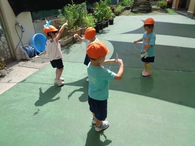 9月に、うさぎ組では、ブドウやとんぼを作りました。作って飾るだけでなく、子供たちが作ったもので自由に遊べるように、取りやすく片付けやすいように工夫して環境を構成しています。自分で作ったとんぼを持って、うれしそうに園庭に駆け出していく姿が見られました。