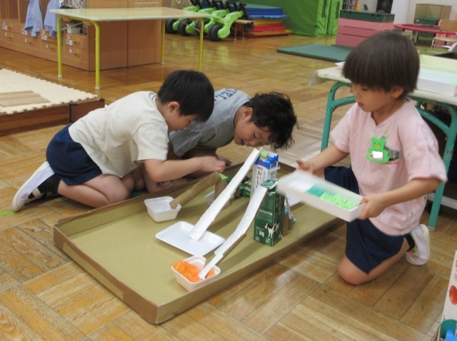 また、ぱんだ組でも、人形のすべり台ができると、ぞう組さんに声をかけ、すべり台のチケットを渡して遊びに来てもらっていました。