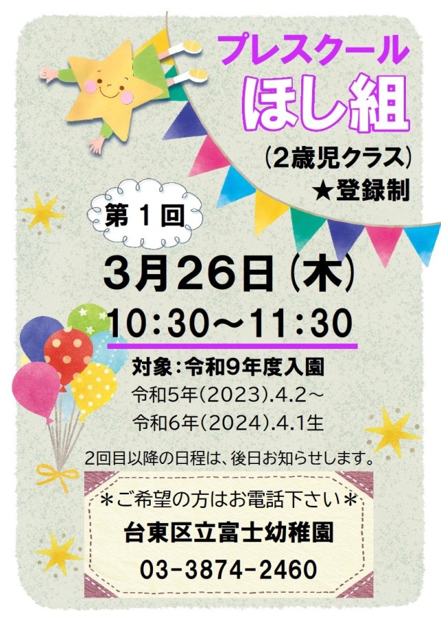登録制ですので、ご希望の方は幼稚園03-3874-2460までお電話をください。