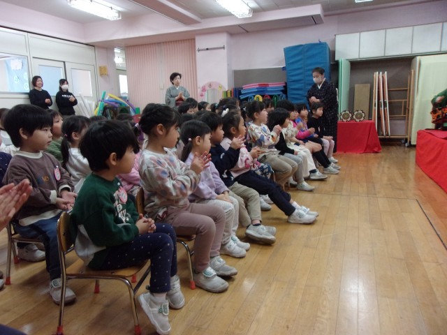 年長月組は、先生の唄に合わせて小鼓をたたかせていただきました。