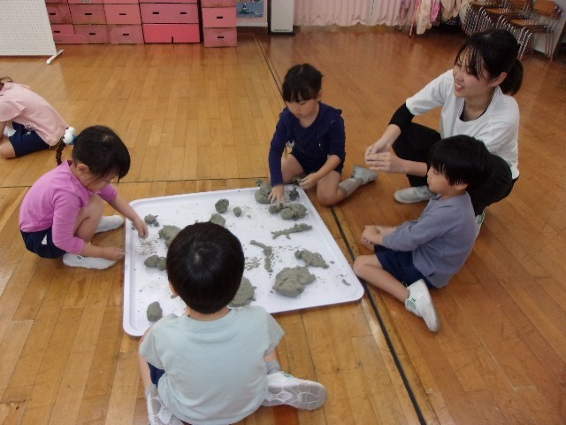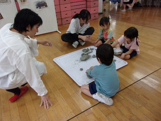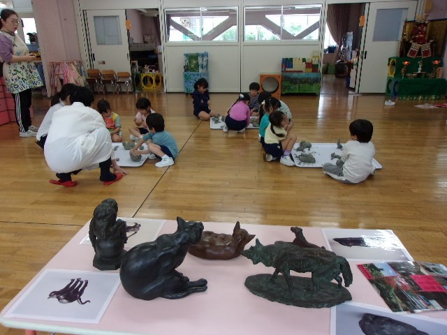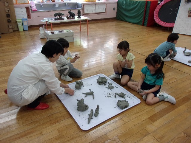 今回は朝倉彫塑館の方に来ていただき、年長月組が粘土で動物を作りました。