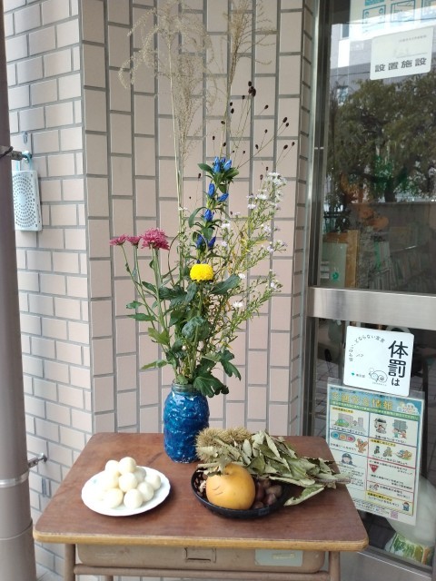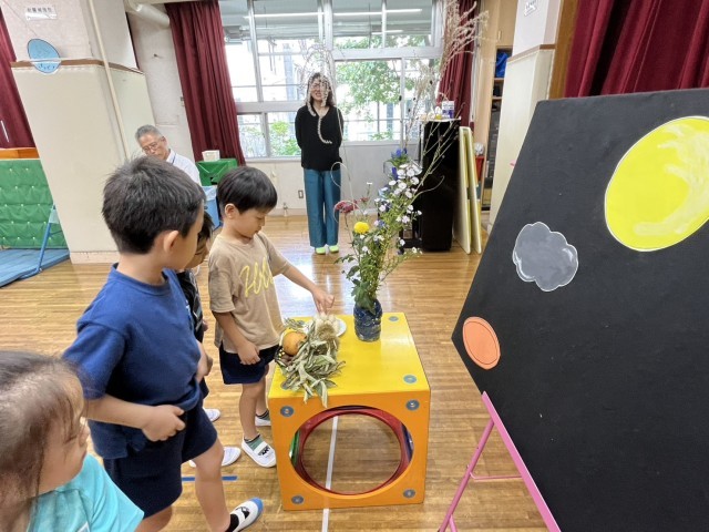 年長児は、先週お花の会で華道の先生の指導のもと、秋のお花を使った生け花をしました。園にもお月見団子と一緒に飾りました。