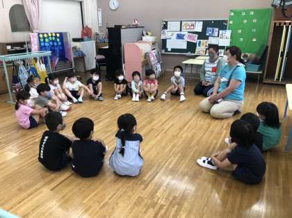 その後は、校庭ににこちゃん探検に出かけました。「チョウチョがお花の蜜を吸ってる〜」「このお豆見て!すごい大きい」「こっちも見て」と、いろいろなものを見付けていました。お互いの名前を呼び合う声も沢山聞こえてきて、一緒に遊びながら親しみの気持ちも深まっているようです。