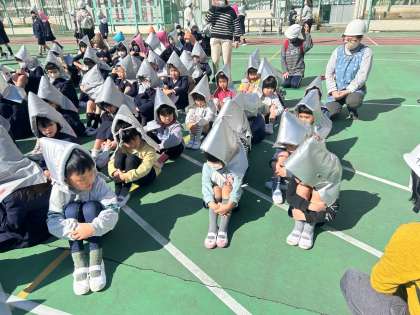 千束小学校と合同で避難訓練をしました。つき組の保育室で遊んでいたほし組は、サイレンの音か聞こえると遊んでいた手を止めて、放送を聞こうと音のする方に顔を向けていました。