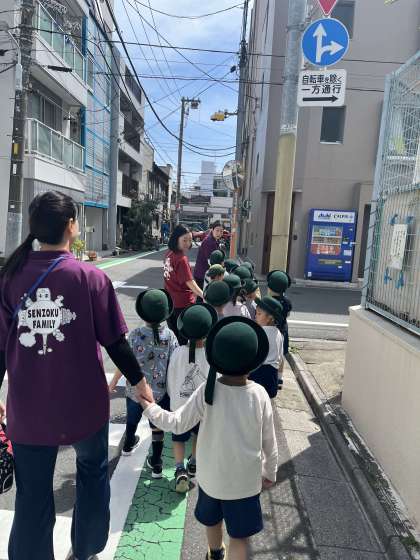 にじ組つき組は自分たちで、ほし組は親子一緒に歩いて富士公園まで行き、一葉桜まつりに参加しました。今日を迎えるまでに、小学生のお兄さんお姉さんの演奏を聞いたり、実際に演奏に合わせて踊ってみたりしました。ほし組も朝から「素敵な音がする!」と遊戯室へ観に行き、お祭りへの期待がますます高まっていました。