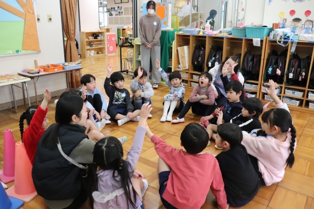 写真は、帰ってきて、1年生から教えてもらったことをみんなで話し合っているところです。どの子も新鮮だったようで、よく見たり聞いたりしていました。「筆箱を見たよ」「中には何が入っていたの?」「鉛筆と消しゴムとながいやつ」「色のついた鉛筆もあったね」「れんらくちょうもあったよ。緑と青のやつ」「何に使うんだろうね、わからないな」「小学生のお姉ちゃんは持っているよ」「タブレットで何をしたの?」「漢字と算数」「えー、ぼく漢字できないと思う!」などなど、たくさん伝えたくて、たくさん真剣に聞いていたぞう組でした。おうちに帰って、改めてランドセルを背負って楽しんでいるかもしれませんね(^▽^)/ 1年生のみなさん、先生方、ありがとうございました。