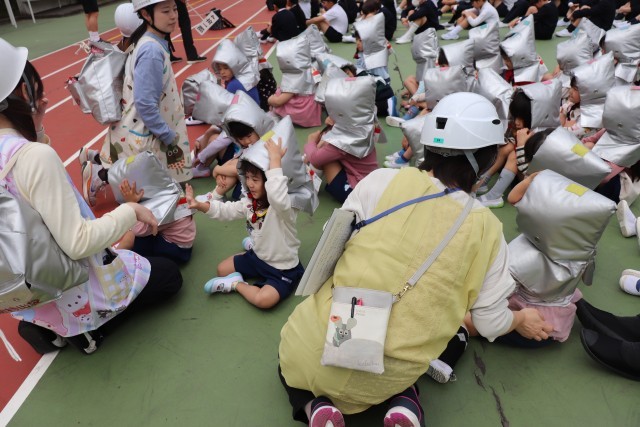 4月、初めての避難訓練をしました。小学校と一緒に、1年を通していろいろな避難の仕方を訓練します。火事・地震・不審者侵入時の対応訓練・学校にいられなくなった時の近隣の公園への避難など…。3歳児りす組も入園して2週間、初めての訓練ですが泣いたり怖がったりせずに頑張りました。5歳児ぞう組は、全体の訓練の後に、改めて地震の際に安全な場所である、物が「落ちてこない」「倒れてこない」「動いてこない」を場所をクラスのみんなで真剣に探していました。教員も、明日来るかもしれない災害に対して、様々な想定や改善策を常に考えて、子供たちの命を守れるように気を引き締めています。