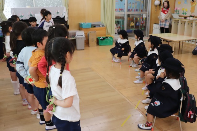 入園して1週間ちょっとのりす組さんに、素敵なお客さんが来てくれました。火曜日には4歳児うさぎぐみが、金竜幼稚園の園歌を歌いに来てくれました。そして同じ週の木曜日には5歳児ぞう組が手作りメダルをプレゼントしてくれました。入園式の時もそうでしたが、お兄さんお姉さんがすることに、とっても興味津々で嬉しい気持ちいっぱいのりす組でした。