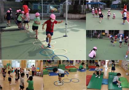 りす組では、最近「へんてこきかんしゃ」のリズム遊びを楽しんでいる他、巧技台を組み立てたところをオリンピック会場にして、様々な動きを楽しんでいます。