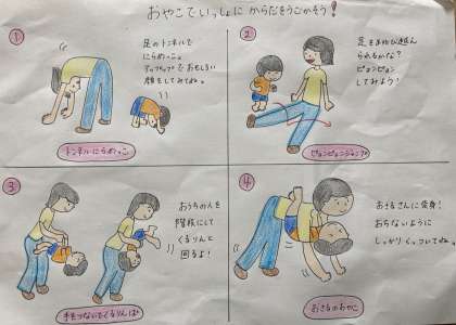 おうちの人は床に手をついて、ひざを伸ばしたハイハイの状態になります。子供はおうちの人の首に手を回し、背中に足をひっかけてしがみつきます。おうちの人はそのまま前に進みます。