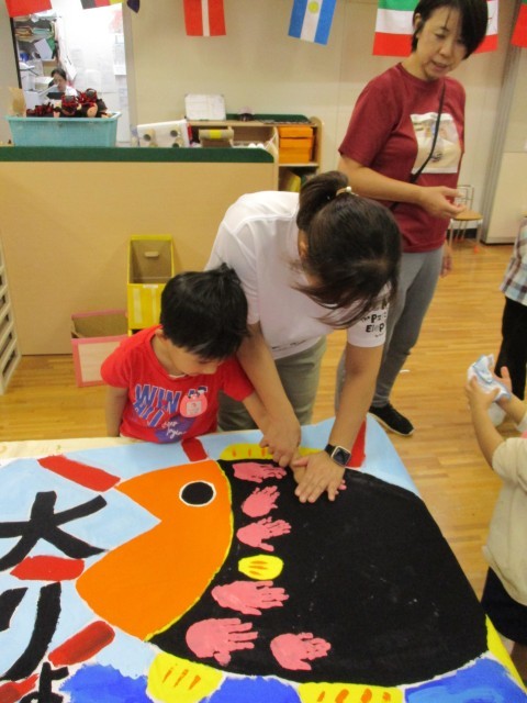 当日は、ばら組、もも組、うめ組の手形を付けた大漁旗で、ばら組の「ソーラン節」を応援し盛り上げました。