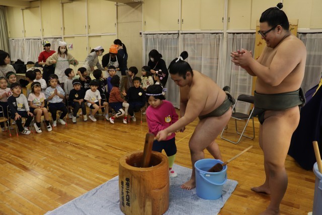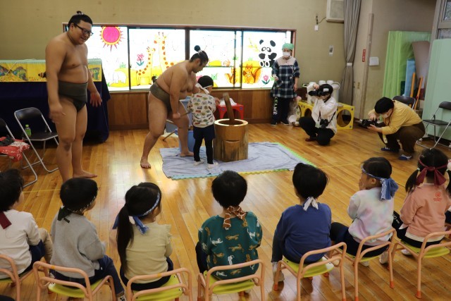その後、お相撲さんと一緒にもちをつきました。「よいしょ、よいしょ」と皆で掛け声をかけて応援しました。