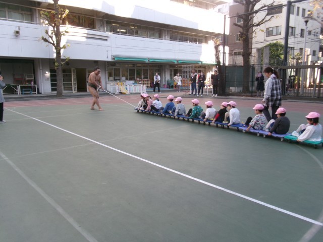 校庭で子供たちが乗った台車を引っ張ってもらい、「お相撲さんってすごい力だね」と子供たちも驚いていました。