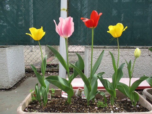 温かな春の日差しの中、子供たちが植えたチューリップが満開になっています。