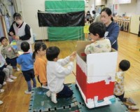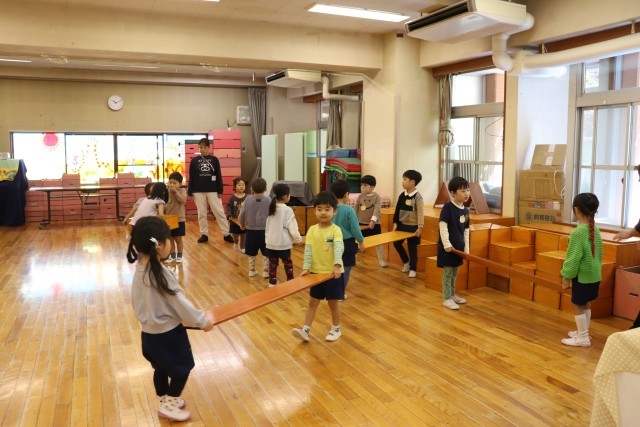 年長ばら組は大型積み木を運び、遊びの場を自分たちで整えました。
