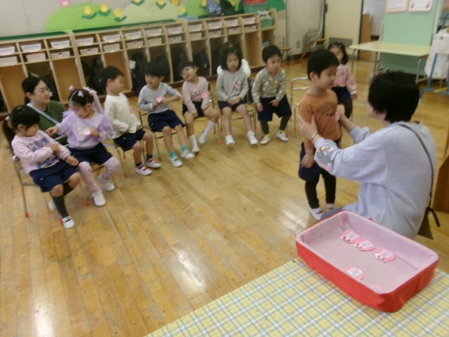 園長先生からいただいた名札を担任からつけてもらい、進級した喜びがいっぱいの子供たち。