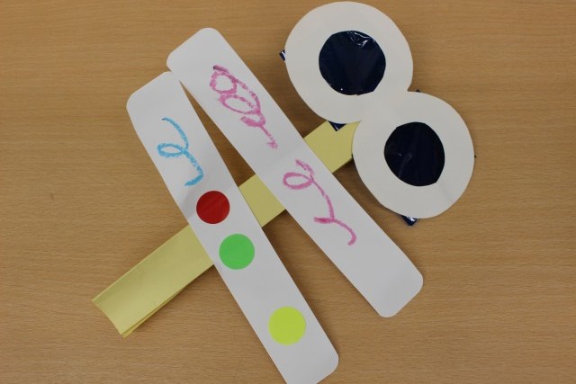 完成すると“めがね”の部分を覗き込み、もう1つ作るお子さんも。左右で違った色を選んだお子さんもいました。