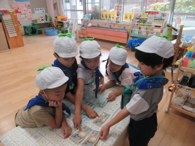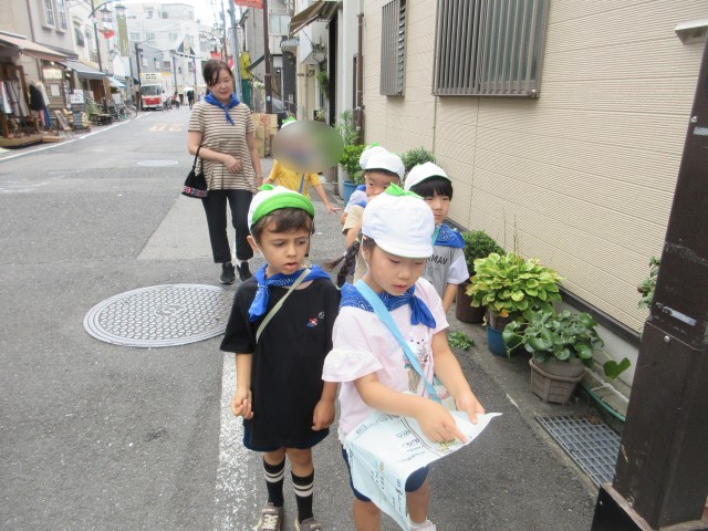 先日、探検隊ごっこを楽しんでいるあおば組が、買い物の地図をもち、谷中の町へ十五夜探検に出掛けました。