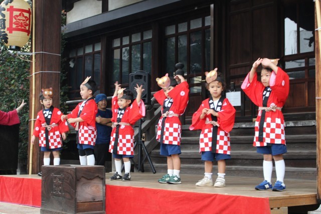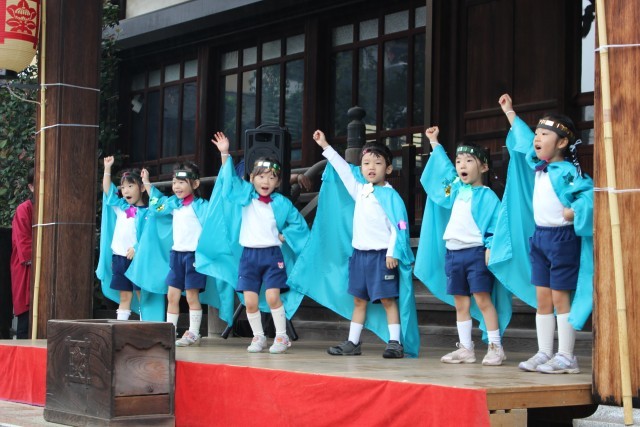 幼稚園の年長組が大きなステージで台桜の伝統である獅子舞を、年中組が大圓寺で大好きなダンス2曲を踊りました。