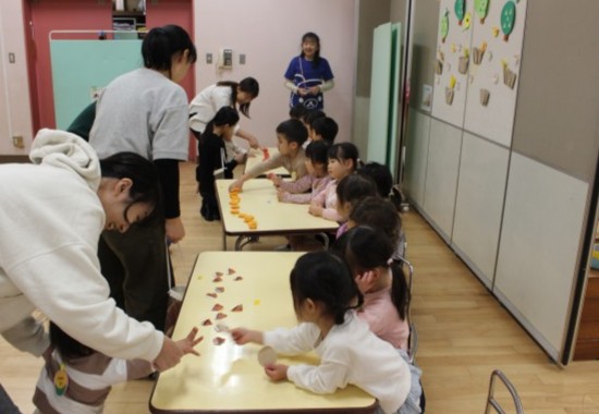 遊戯室では、年中わかば組が、手作りの “くり” “みかん” “りんご” のお店を開いていました。「どれがいいですか。」「えらんでいいよ。」「2ついいよ。」などと、自分よりも小さなちゅうりっぷ組のお友達に、優しく声をかけてくれていました。