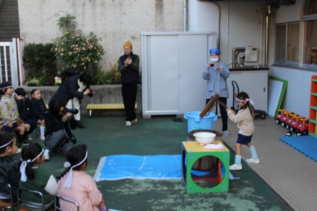4歳児は自分の番になると「よーし頑張るぞ」と出てきますが、杵が思っていたより重かったようで「ペタン ペタン」と可愛い音でついていました。