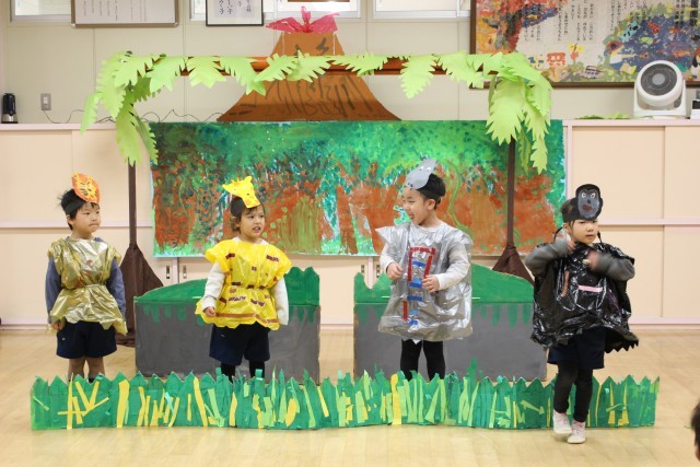 年長組が恐竜博士や探検隊になり、年中組はそれまでしていた遊びから、森の妖精・南の島の子どもたち・ジャングルの動物たちになることを決めました。それぞれの役の動きやセリフを互いに見合った後、学年合同でセリフを言いながら劇を作っていきました。年長児は、一人一人がしっかり自分の役割に合った言葉を考え、探検隊と研究所の仲間という役同士のやり取りをしていきました。年中組は、同じ役の友達と踊ったり、「なべなべそこぬけ」などの遊びをしました。最後は全員で恐竜ダンスを元気いっぱいに踊りました。役ごとに観客の保護者の方たちに挨拶をしたり、再度登場して保護者の方の感想も聞きみんなとても満足感でいっぱいになりました。