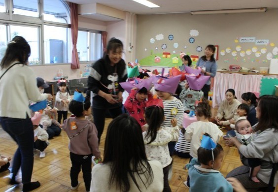 最後にはいよいよ、豆まきごっこです!茶色い紙を丸めたものを豆に見立て、親子で豆作りをしていると・・・「鬼だぞー」と年中組の子ども鬼がお部屋に入ってきました。こども鬼は事前の相談で、小さい子が泣かないように優しい鬼にしようと決めていたようで、優しい鬼たちは豆を投げられると次々と座り込んでいました。(豆が当たってやられた~のポーズ)