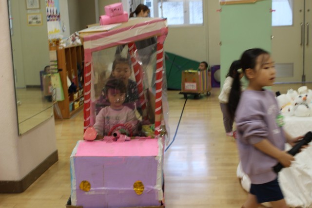 遊びの時間には、年長組が作ったミニ遊園地の乗り物にもご招待。(先日花やしき遠足に行き、子どもたちが「遊園地を作りたい!」と自分たちで考えて作った乗り物です)