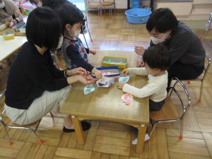 完成すると、キラキラした飾りを嬉しそうに持っていました。周りの保護者の方に「可愛いね」「上手」と声を掛けられ、照れる子も。