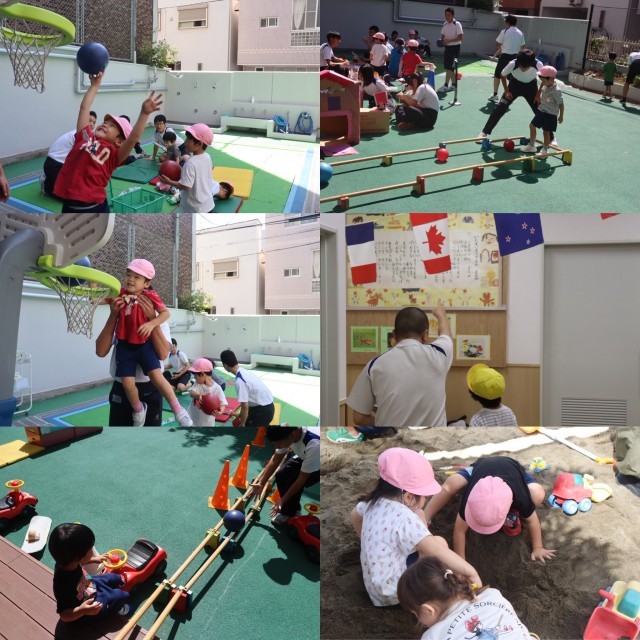 砂場で大きな穴を掘る、バーを使ってボールころころを作る、バスケごっこをする。