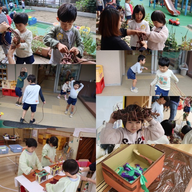 そのつるを使って、きく組がリースの土台作りをしました。長いつるを見て、縄跳びをする姿も。