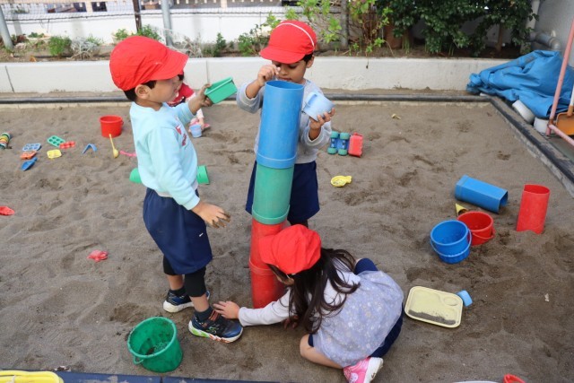 組み合わせ方は「こっちを下にすると落ちないんだよ」と、しっかりはまる方を一緒に遊んでいるうめ組さんに知らせています。