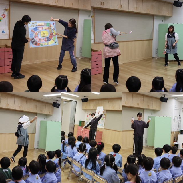 始業式で、先生たちが様々なお正月遊びを紹介しました。