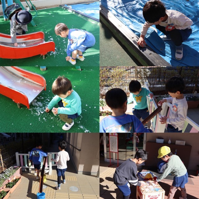 雪が降った日曜日の翌日、子供たちは登園するとすぐに氷になった雪で遊び始めました。