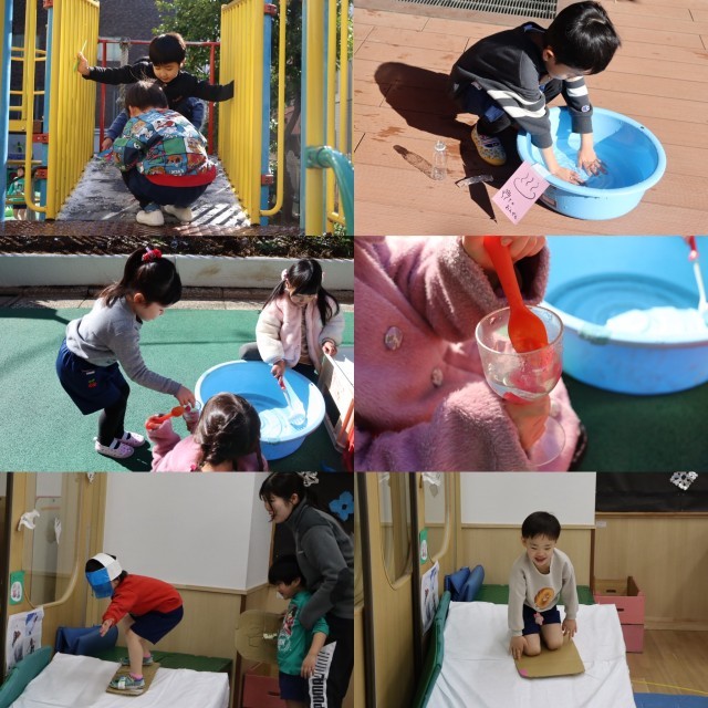 など、冷たさを味わったり、氷の性質を感じたり、見立てたりしながら、思い思いに関わっていました。