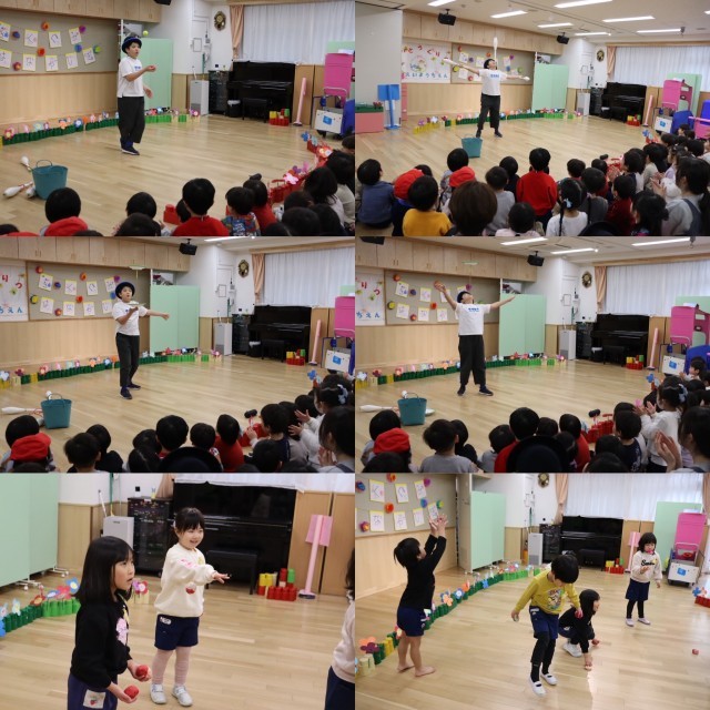 幼稚園にあるお手玉や、持参してくれたクラブや縄、お皿などの道具を使って、プロ顔負けの見事な技を見せてくれて、会場は拍手喝采の大盛り上がり!