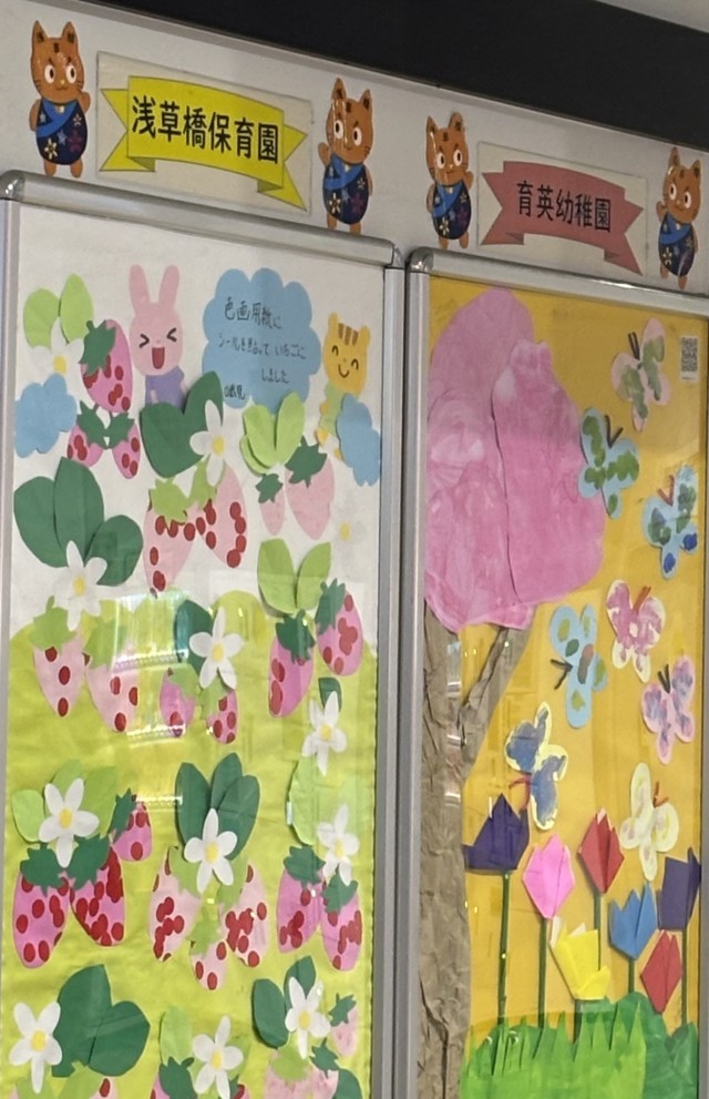 3歳児うめ組が作ったちょうちょやチューリップを浅草橋駅に飾っていただきました。