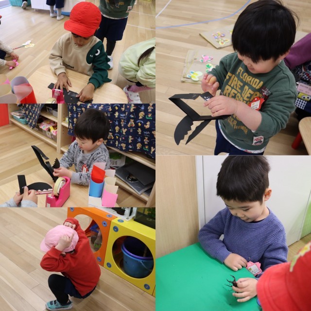 途中、大あごをつけた園長を見て、自分のものもほしくなり、お面を作って次々とクワガタになっていました。