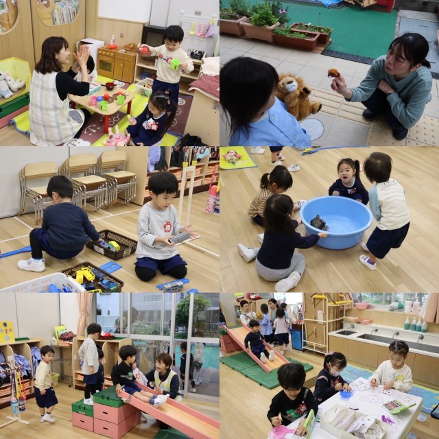 入園したばかりの3歳児うめ組は、好きな場所、好きなもので遊んで過ごしました。