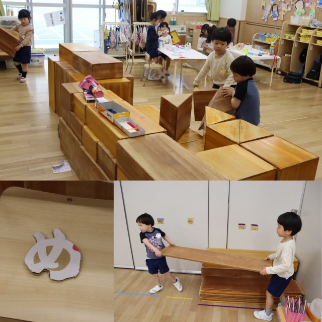 さくら組もきく組も、進級して使えるようになった木製の積み木が人気です。