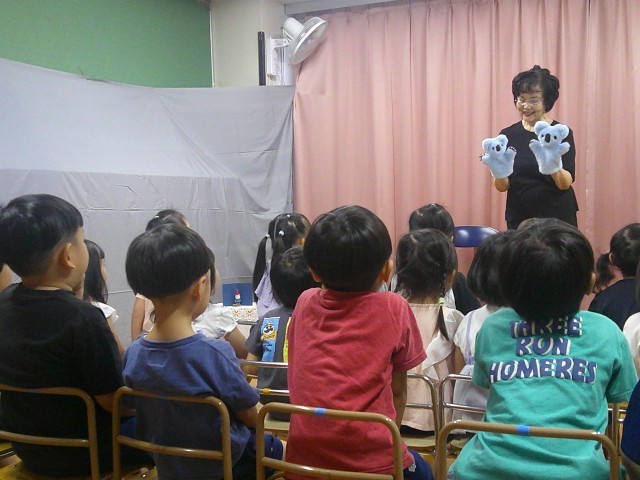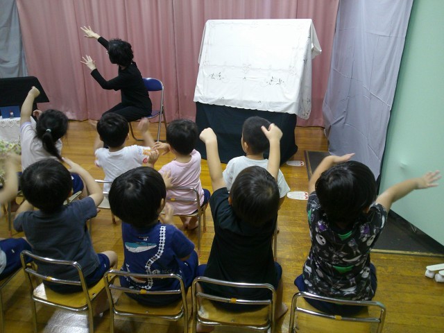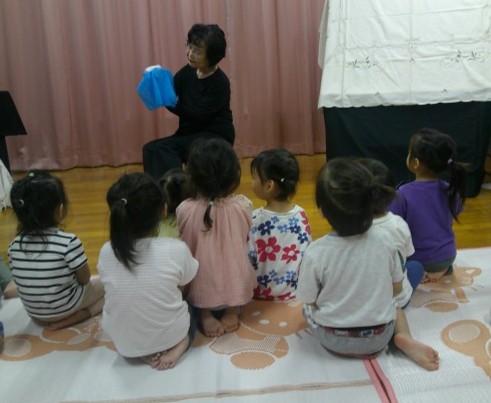カーテンが掛かっているいつもと違う雰囲気のリスルームの中で、清水先生と一緒に手遊びをしたりペープサートを見たり、素話を聞いたり楽しい時間を過ごしました。