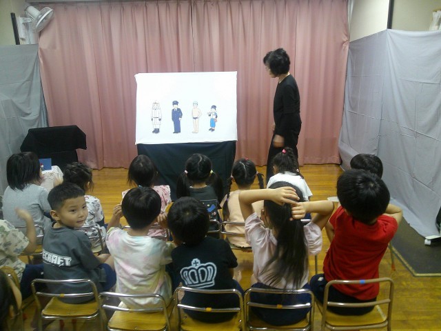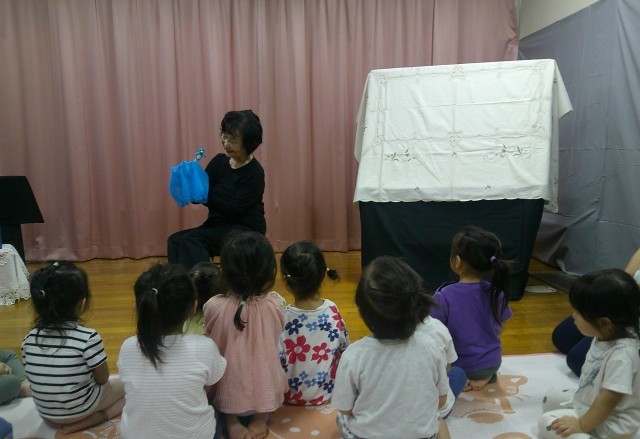 カーテンが掛かっているいつもと違う雰囲気のリスルームの中で、清水先生と一緒に手遊びをしたりペープサートを見たり、素話を聞いたり楽しい時間を過ごしました。