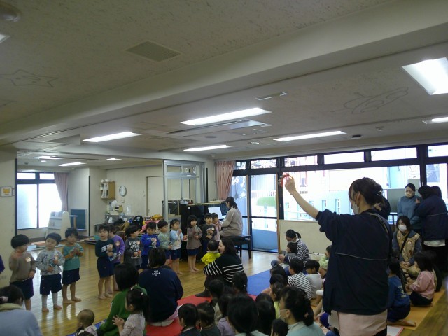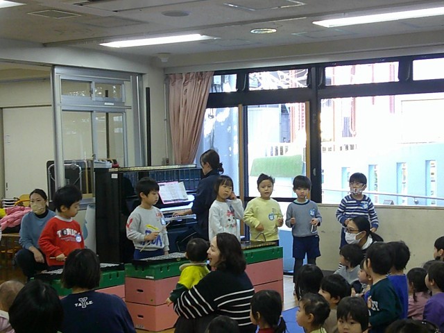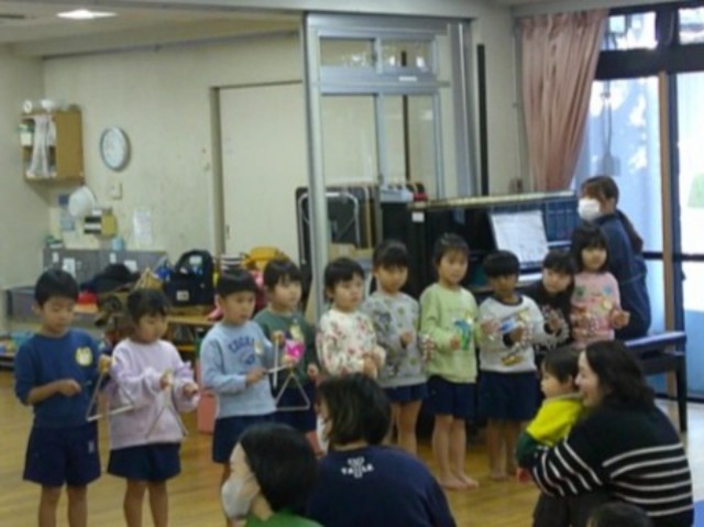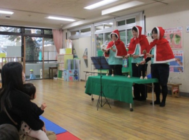 また、幼児クラスの子供たちによる歌や合奏、職員によるハンドベルの演奏を行いました。11日は年長児・5歳児そら組による歌「てをつなごう」、15日は合奏・3歳児にじ組「ゆきだるまのチャチャチャ」、4歳児ほし組「ニャニュニョのてんきよほう」、5歳児そら組「勇気100%」を披露すると、お子さんも演奏する園児を見つめたり拍手をしたりして、興味をもってよく聞いてくれました。保護者の方からは、「大きくなると、このような成長が見られるのですね」「感動して涙が出ました」などの温かいご感想をいただきました。ありがとうございました。