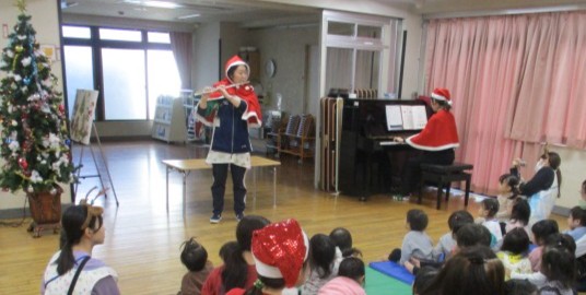 乳児クラスでは、先生たちのパネルシアターを見たり、ハンドベルやフルートとピアノの演奏を聴いたりしました!子供たちも鈴を鳴らしたり、知っている曲に合わせて体を揺らしたりして楽しんでいました!最後にサンタクロースが登場すると少しびっくりしていた子供たちでしたが、プレゼントをもらうと笑顔を見せていました。