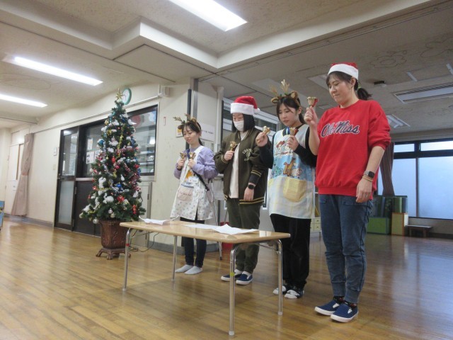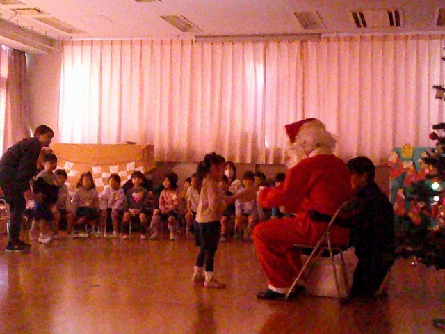 お楽しみ会を楽しんでいると、、、みんなのもとへあわてんぼうのサンタクロースがやってきました!!サンタクロースが持っている大きな白い袋を見て、大興奮の子供たち。プレゼントをもらうとお礼を言って、みんなで歌のプレゼントをしました。