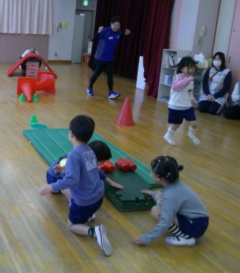 今回は、JACOTの映先生の他にイッシー先生も来てくださり、体感と四肢の連動性を高めるラディアン運動を始め、ボールを使った遊びやジャングル鬼ごっこなどを楽しみました。