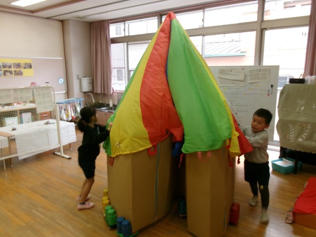 も準備して。。そらやしきが開園しました。乳児クラスが来たときは、「スリラーカーは怖いから、優しいお化けにしよう」